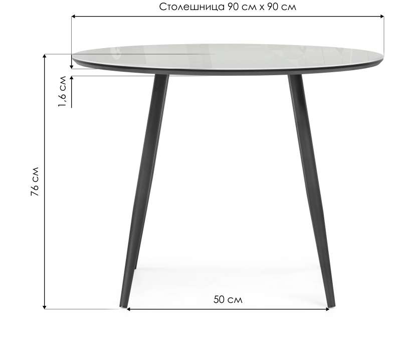 Расстояние между ножками: 50 х 50 см. Толщина столешницы: 2 см. Толщина МДФ под стеклом: 1,6 см. Толщина стекла: 0,4 см.